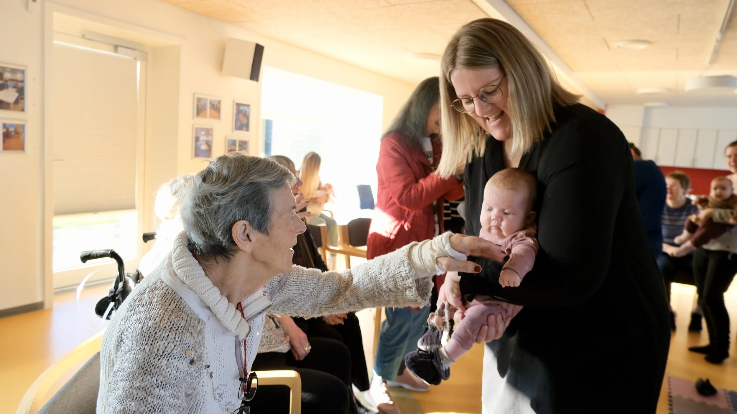 Midt under legestuen får en beboer tårer i øjnene. De gamle danske børnesange, kombineret med synet af lydene af de små babyer rammer noget dybt i hende. Selvom hun er svært ramt af demens og sproget derfor ikke længere er let at finde frem, åbner hun pludselig munden: “Det er fantastisk. Det er fantastisk!” siger hun igen og igen.