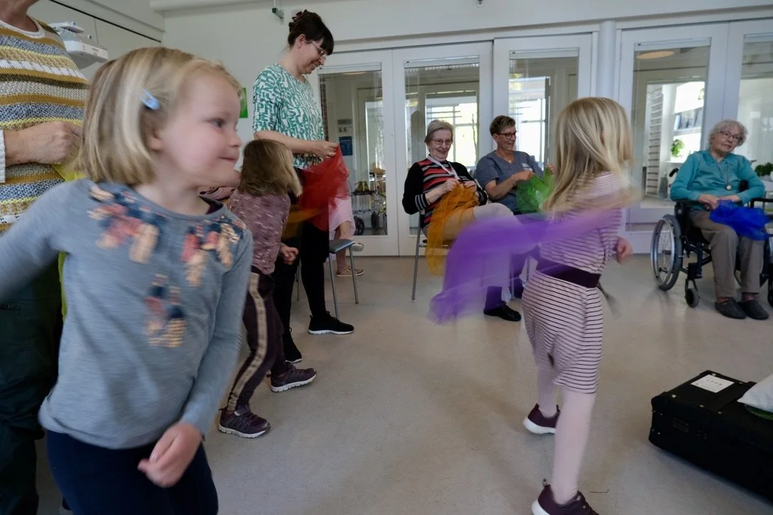 “Når vi laver “save, save brænde” med tørklæder, skal børnene hjælpes til med at turde gøre det med en beboer, og beboerne skal have hjælpen til at holde fast i tørklædet. Så de første gange vi synger den, skal alle lige hjælpes på plads. Men tredje gang - så er smilene store og magien opstår - og så er der altid dem, der til sidst ikke vil aflevere igen - både børn og ældre, haha.”